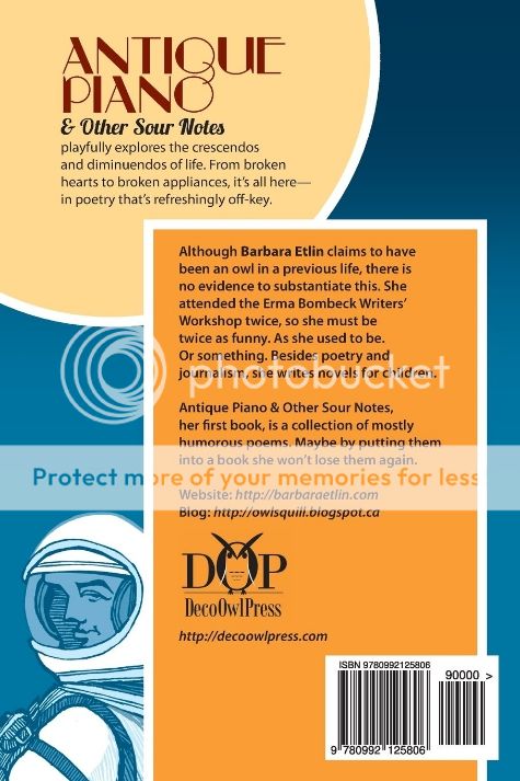 Although Barbara Etlin claims to have been an owl in a previous life, there is no evidence to substantiate this. She attended the Erma Bombeck Writers’ Workshop twice, so she must be twice as funny. As she used to be. Or something. Besides poetry and journalism, she writes novels for children. She lives in a nest in Toronto, where she lives with one patient husband, one genius dog, two electronic cats, and about 300 owls. Antique Piano & Other Sour Notes, her first book, is a collection of mostly humorous poems. Maybe by putting them into a book she won’t lose them again.